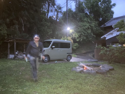 夜も更けた頃突如現れたジェイソン!片手に鉈を持ち小屋に近づいて〜〜ギャー!!。・・・もとい、井戸から酒を手に宴会場に戻るケロであった。知らん人がこの場所でこの景色は怖いやろうなあ・・・。酒を飲むとただでさえ人相の悪い男が一層怪しい(笑)