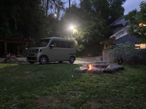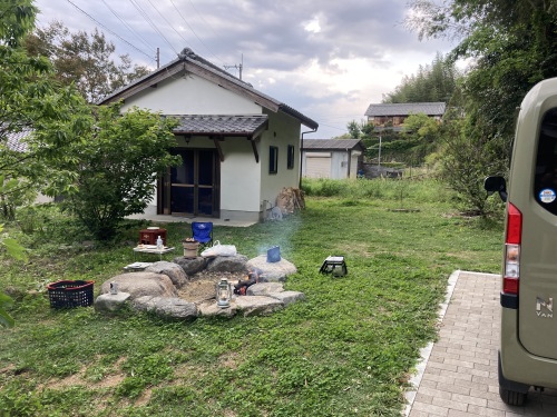 日が暮れてきて焚火も良い感じになってきた・・・のだが予想していなかった雨が降ってきた(それも結構な本降り)。幸いにしてOの小屋には軒先があってそこに移動して宴会を続ける。