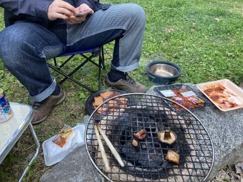 焚火場で夕食の用意を始める。今日のメニューは肉とホルモン、そしてケロ持参のスモークコース。