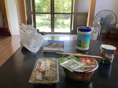 インスタントラーメンと、土産の「でんがら」をつまみ食い。なんだかパサパサした草餅といった感じで、なんだかとっても純朴な感じだ。黒滝の草餅とかの方が好みかな。
