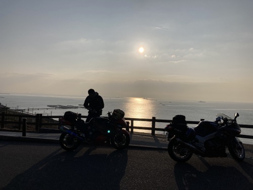 7時西宮でシャーミンさん@ZZR1400と合流。お会いするのは2020年の「紀伊半島ツーリング」以来3年半振り。阪神高速で若宮ICまで走り、最初に須磨浦公園の展望台で小休止。条件が良ければ大阪湾〜淡路島が一望できるのだが、この日は生憎霞が掛かっていて見通せなかった。それでも登ったばかりの日の出を見ながら暫し近況報告交換。