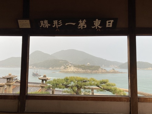 朝鮮通信使が絶賛した展望。真下に道路が走ってはいるが、畳にゆったり座ってみたら額縁で切り取ったようなこの景色。一瞬土砂降りの雨が降ったがタイミングがラッキー。良い景色は天気を選ばないんだな。