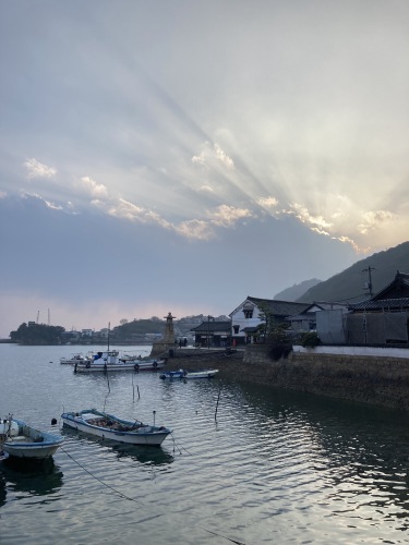 日帰りだったら、絶対観る事が無い時間帯の景色。雨雲の向こうに夕日が差していて、人の気配も少ない汐待の港は穏やかだった。