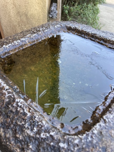 2日目朝。空気が冷たい。千光寺駐車場がオープンするのが9時からなので無理をせず8時半出発として正解だった。宿の前の石桶に分厚い氷!