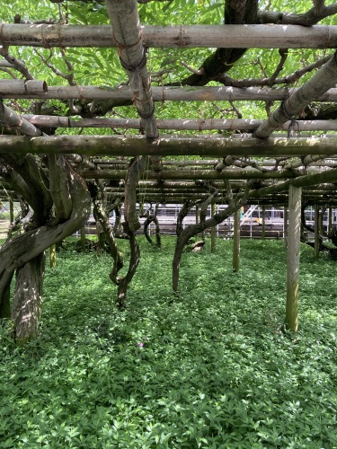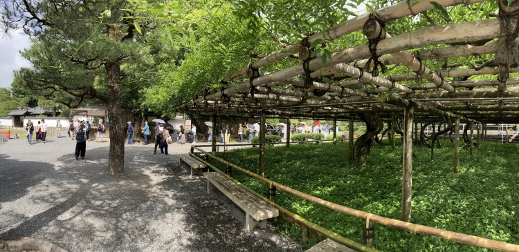 8時半平等院開門。北門の3番乗りで入る事が出来た。そのまま真っすぐ鳳凰堂内部見学受付に並ぶ。30分並んで9時半発の見学券をゲット。すぐ隣りの藤棚が見事。奥の列が内部見学受付の行列。
