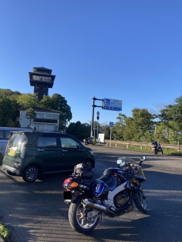 高野山から龍神スカイラインに入ると路面が霧雨で濡れていた。元々スピードが出過ぎる道、無理せず走り7時、道の駅「ごまさんスカイタワー」到着。この時間帯でも早朝からバイク4〜5台は停まっていた。「ツーリングや、ツーリング!」・・・と言いながらレーシングスーツで固めたおっちゃん2台が折り返していった。「路面が濡れているので、軽く流す」という意味なのだろう。