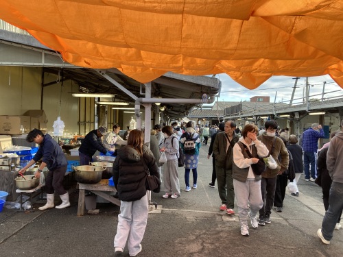 ”サバフグ?しょうが焼”200円、”骨なしはまち・こってり煮”300円、”ハモ×玉ねぎだし煮”300円、”コノシロ甘酢”350円、”沖サザエうま煮”400円・・・。うーん。値段も手ごろでどれも美味そう。「コノシロって何ですか?」「試食してみますか?。お酒の好きな人はこれをワサビ醤油で食べると美味しいですよ。保存も効きます」「うん、何か美味しい」という事でサバフグとハモとコノシロを購入。人が押しかけ、客も売り手も楽しそうに売り買いをしている。これぞ市場の雰囲気!観光名所では無く、こんな生きた朝市が大阪にあったとは。