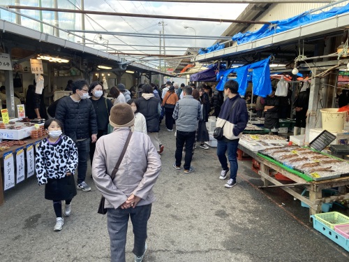 魚のさばき方を習得していたらまとめ買いしたいところ。自分にはその能力が無いのでブラブラ先に進む。天ぷら美味そうなので買おうとしたら「30分程待ってね」と言われて断念。別の店は行列20名程。仕方なくイカ焼を食べてみたら美味かった。ここはまるで”千と千尋の神隠し”湯屋前の露店、濛々とした雰囲気。