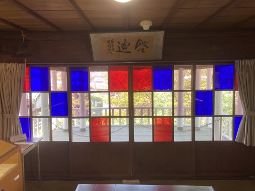 小学校の校舎とは思えない立派なステンドグラスのバルコニー窓。総じて見所が多く楽しい場所だった。