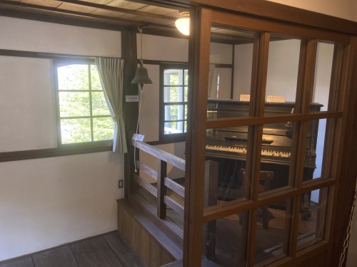 2階のピアノも弾く事が出来る。ところどころ音が鳴らない鍵盤があったりする。調律もされていないが、音を出して弾いてみれるといのが楽しい。