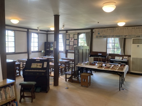 内部は博物館になっていて、大正〜昭和の教室が復元されている。ここが面白いのは、自由に触ったり遊んだり、楽器を弾いてみて良い事。「手をお触れにならないで下さい」という博物館は山ほどあるが、「どうぞ触ってみて下さい」というスタンスの所は初めてで、足踏みオルガンや打楽器等々色々試してみる事が出来た。