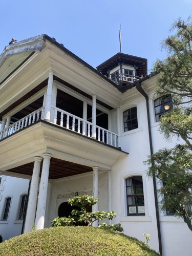 1881年に建てられた和洋折衷・大正浪漫な小学校。テラスと鐘楼のファザードが美しい。