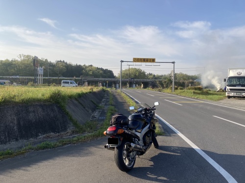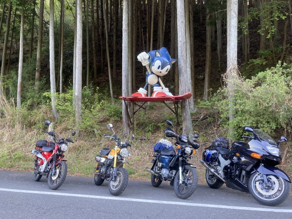 7時過ぎ道の脇にひと際デカいソニック像が佇んでいた。そもそも”ソニック”なるものがどんなキャラなのかも知らないので特別な感動も無かったのだが(帰宅後確認セガのゲームソフトのキャラらしい)。少し小休止していると青・黄・赤3色のカラフルなハンターカブ御一行が到着。人懐っこい中年のオヤジさん3人組。なんと関東から遠征。昨日は三重に宿泊〜この日はこのソニックを観た後関西まで走るそうだ。