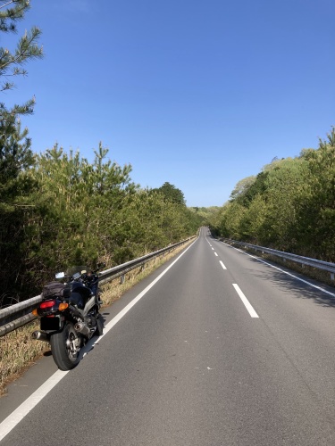 記念撮影をするとの事で、仲間にいれて頂いた。私のZX-11だけ違和感があるが、これもソロツーリングならでは。それにしてもハンターカブの機動力はなかなかのものだ。皆様と別れて先に進む。ここソニックがコース南端近辺、間もなく山の中を折り返す。この辺りは案内板も皆無で、事前確認とナビが無いとわかりそうにない。