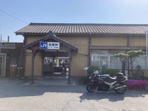 名阪国道を一旦くぐって柘植駅で小休止。辺鄙な田舎の駅舎だが設立は何と1890年、実は歴史ある駅らしい。雑誌ではこの近くに鉄道遺構があるとの事だったが、バイクを置いて廻りを探しても見つけきれなかった。