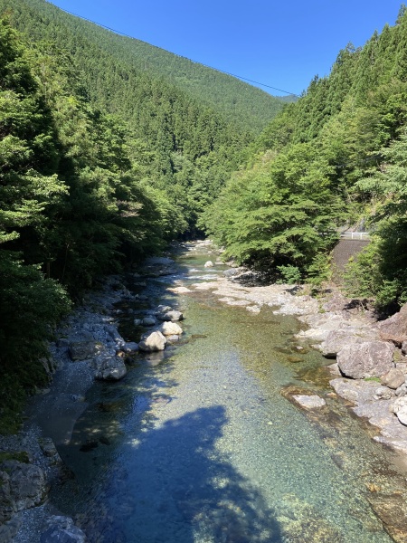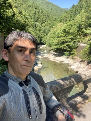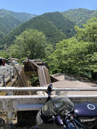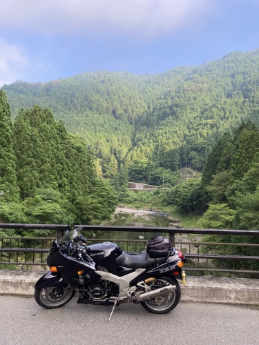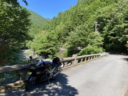 県道53号のこの橋が休憩ポイント。近くに民家もあるのだがこの位置からだと見えなくて、橋の上でエンジンを切るといろんな動物や鳥の鳴き声が360°から聴こえてくる。天候が良ければ川の水も綺麗。