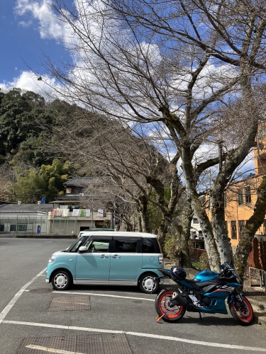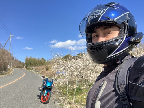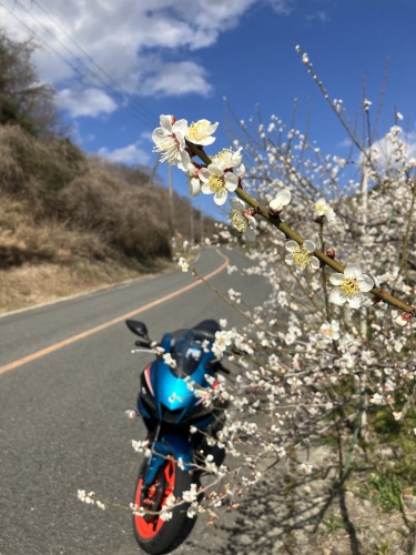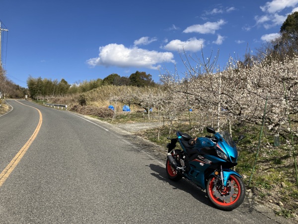 白い花が満開の農道沿いの梅林で思わずR3を停める。気温も20℃を越えてすっかり春だ。私以外でもここの綺麗さに立ち止まる車がチラホラ。