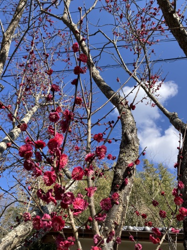 13時前にOの庭到着、異常なし。去年明日香村の猟友会が活躍して下さって、懸案の猪/鹿被害は暫く出ていない。梅の花はパラパラと、多分一斉に満開にはならないんだろう。数年前の私の剪定失敗の影響がまだ抜けられない感じか。でも地味な咲き方はするけれど、ここの紅色の花は雛人形のこの時期に栄えて好きだ。